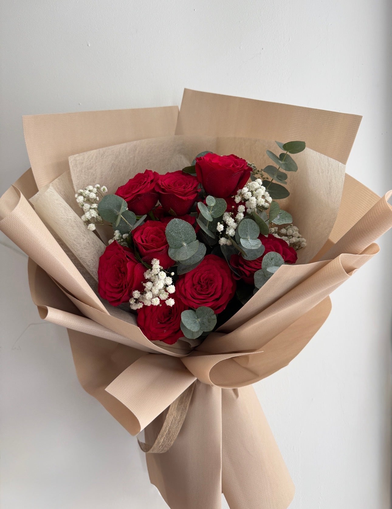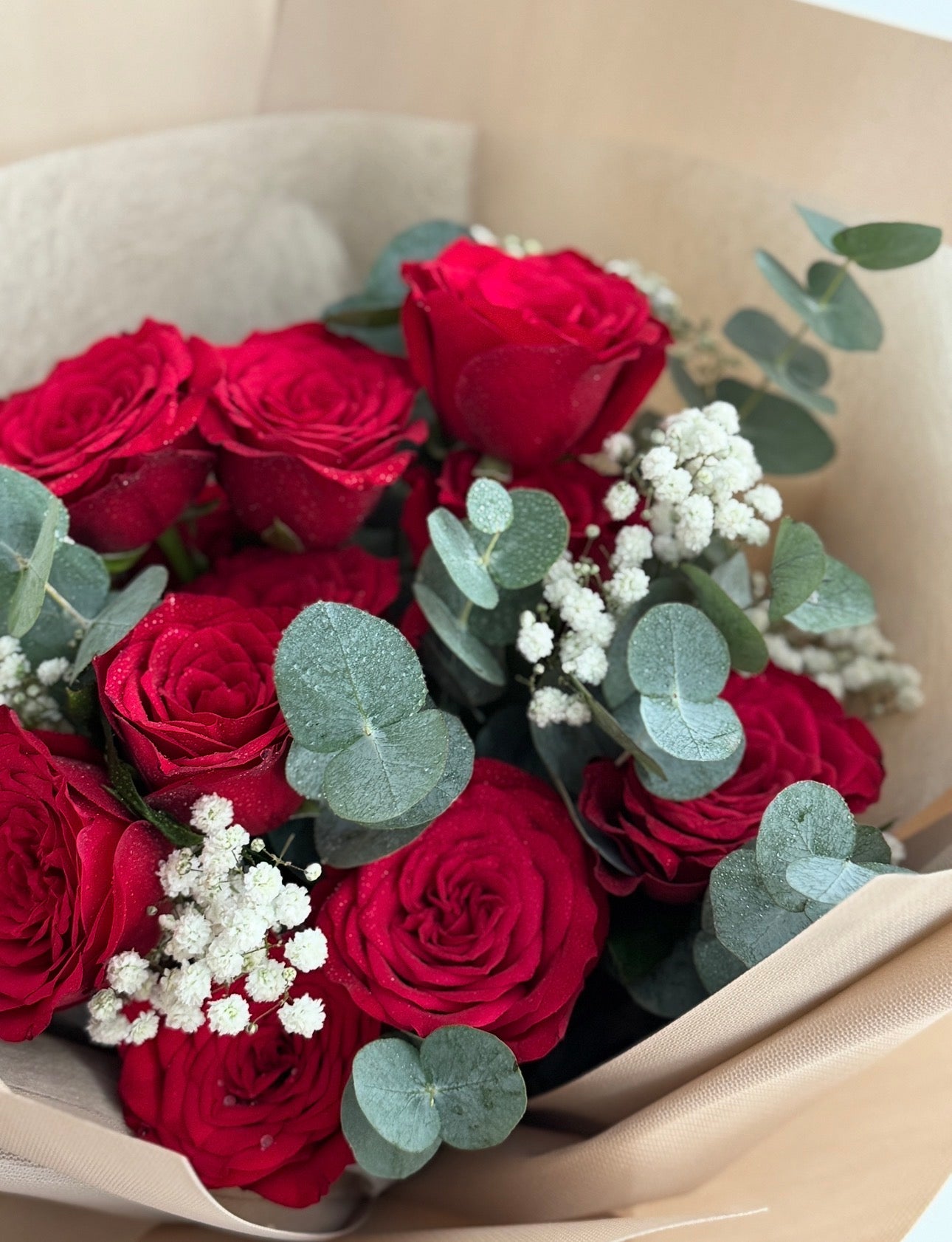 Red Rose (10), Baby Breath and Eucalyptus in XXL size