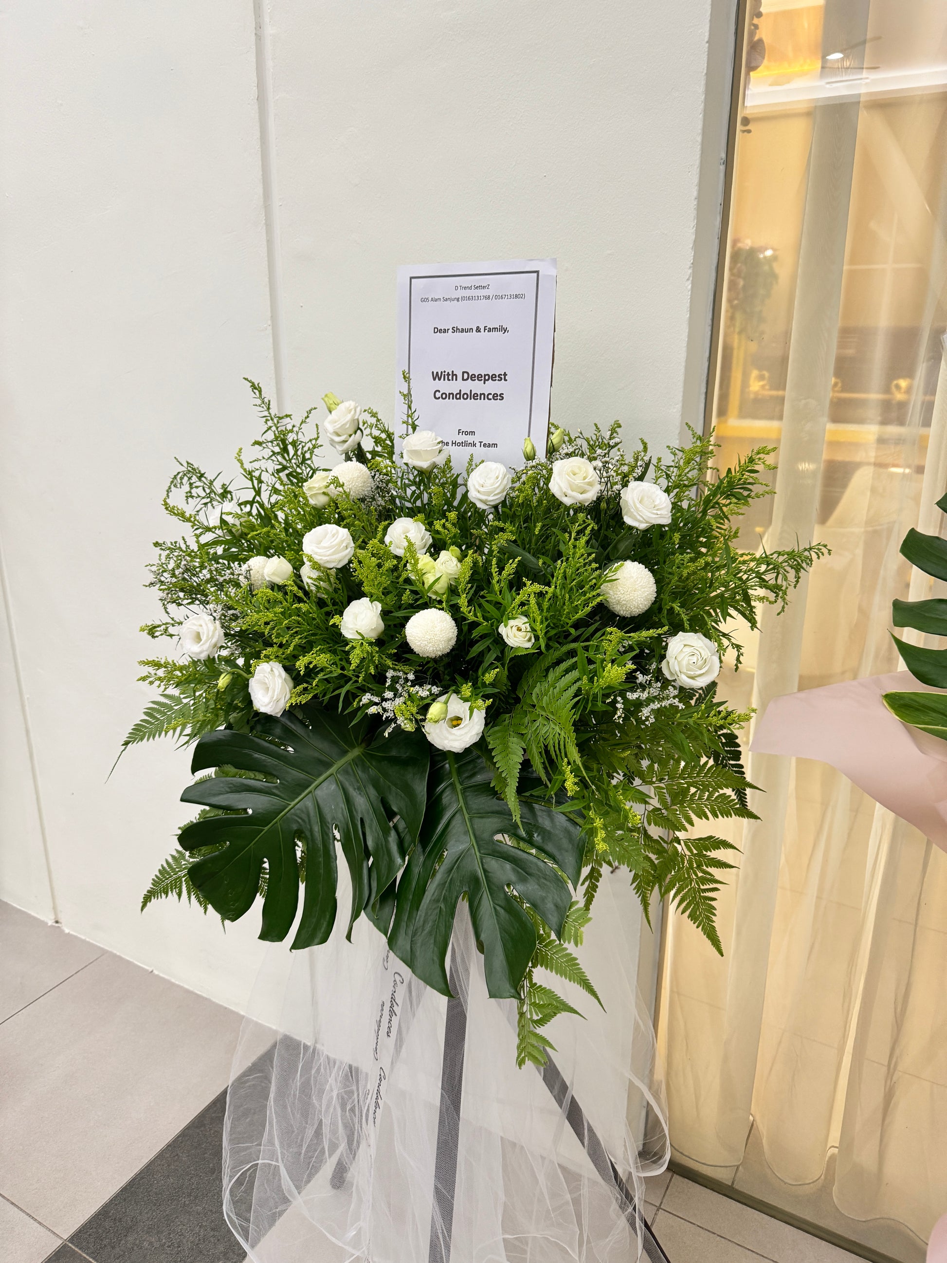 White Eustoma, Yellow Peacock, White Ping Pong, Tube Rose & Monstera Leaf