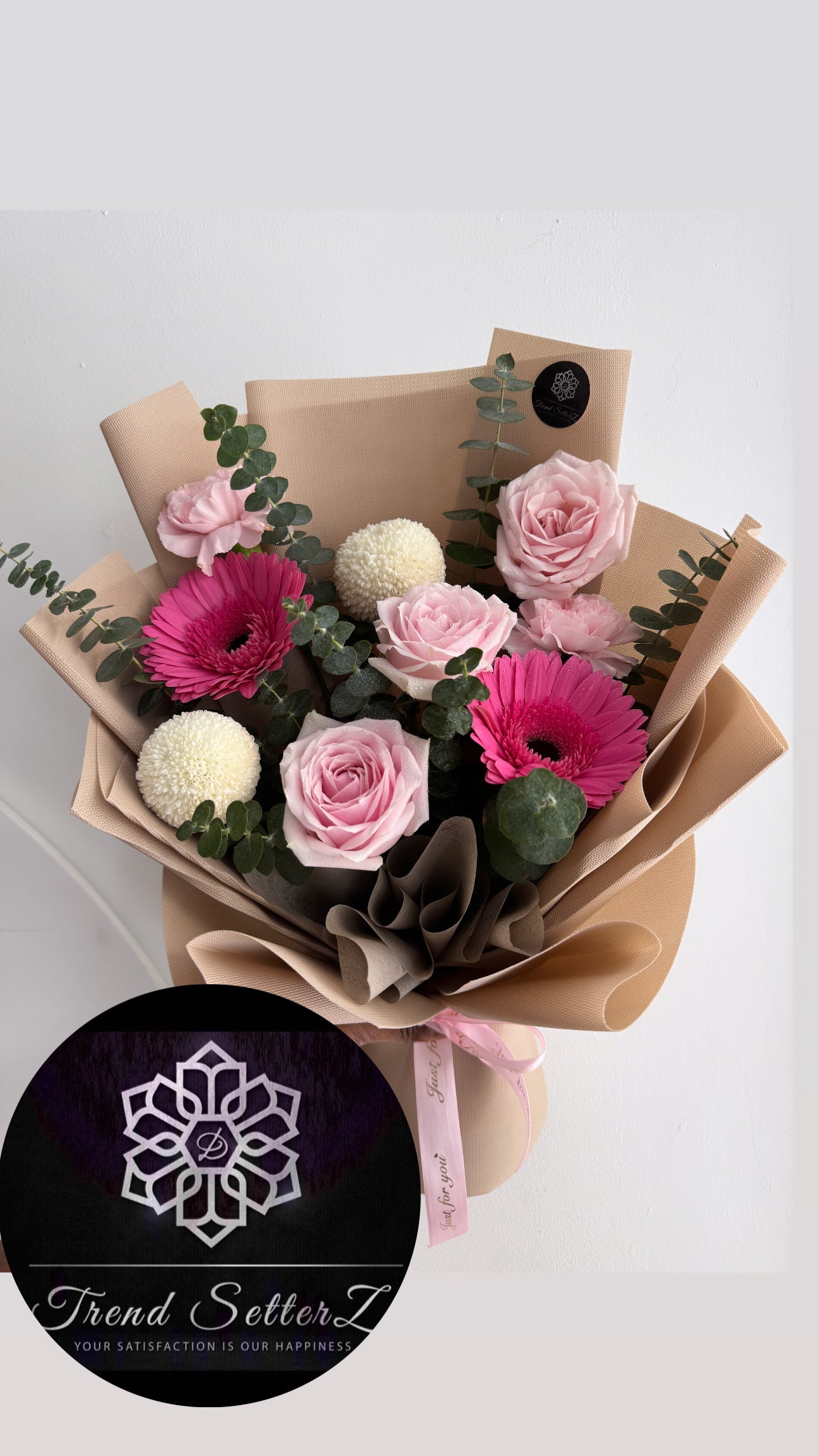 Pink Gerbera (2), Soft pink Rose (4), White Eustoma and Eucalyptus